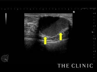 この方のしこりは吸引針で穿刺するだけの処置で除去することができるものでした。ただし、触診では確実にしこりに吸引針を刺すことが困難です。そのため、このようにリアルタイムで映し出されるエコー画像を確認しながら、しこりに吸引針を挿入し、オイルとなった脂肪を吸い出していきます。