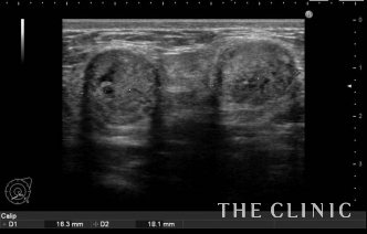 エコー検査では、両方のバストに多数のしこりを確認。超音波を反射しそれより内部が黒くなりなっていることから、しこりの辺縁には石灰化が認められます。