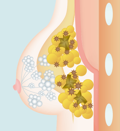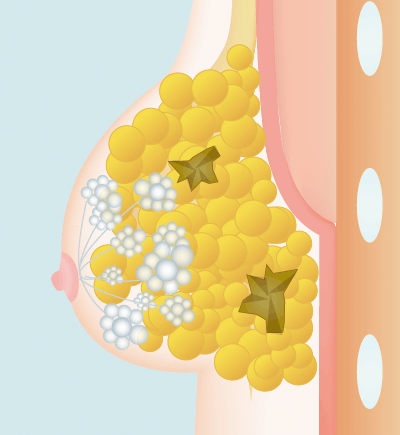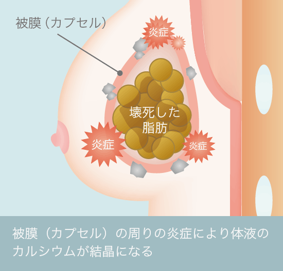大きな塊で壊死した脂肪を閉じ込めようとしてできた被膜の周囲に、カルシウムが沈着するトラブルです。程度が強過ぎると吸引することができず、摘出手術が必要になることも考えられます。