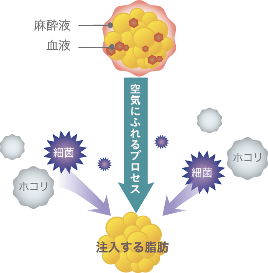 上記のような要因を避ける方法で注入することが必要です。まず、きちんと処理された良質な脂肪を、あらゆる層から少量ずつ注入するマルチプルインジェクション技術で注入できるドクターを選ぶこと。また、大量の脂肪を注入できるという宣伝は危険です。個人差はありますが、おおよそ片胸250ccが限度と言えるでしょう。
