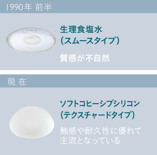 初期のシリコンバッグは耐久性が低く、バッグが破損して漏出した際にバストが変形したり炎症を起したりするトラブルが多発していました。そのためメーカー各社が改良を重ねるたびに耐久性や触感、質感の異なるバッグが増えていきました。1990年代には安全性から生理食塩水バッグが推奨されていましたが質感が不自然ということもあり、現在ではソフトコヒーシブシリコンが主流。なかでも、表面がつるつるしているスムースタイプではなく、リップリングなどを起こしにくいとされるテクスチャードタイプが支持を集めています。