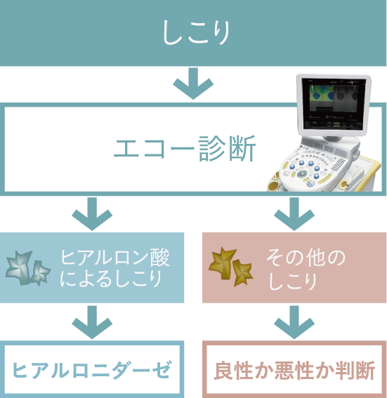 しこりがヒアルロン酸によるものであれば、ほとんどの場合は、ヒアルロニダーゼというヒアルロン酸溶解液をしこりに注入することで、しこりをなくすことができます。