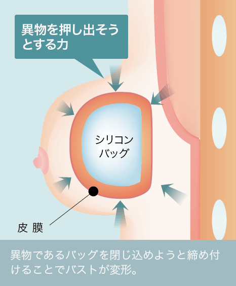 年月が経つごとにバストが硬くいびつに変形してくるトラブルです。これは人工物であるシリコンバッグを閉じ込めようとする体の自然な働きですが、強く反応が出るとバッグの破損も引き起こします。